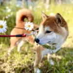 元保護犬の柴犬りゅう、散歩中にくっつき虫アクセサリーを身に着ける